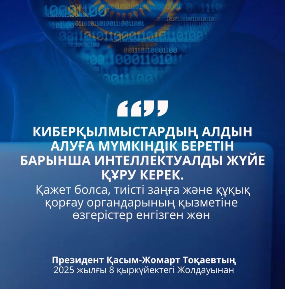Президент Қасым-Жомарт Тоқаевтың 2025 жылғы 8 қыркүйектегі Жолдауында атап өткендей, киберқылмыстардың алдын алуға мүмкіндік беретін заманауи, интеллектуалды жүйе құру қажет. Бұл ретте қажеттілігіне қарай тиісті заңнамаға өзгерістер енгізу және құқық қорғау органдарының қызметін жетілдіру міндеті тұр.
